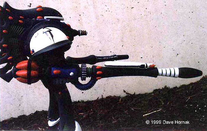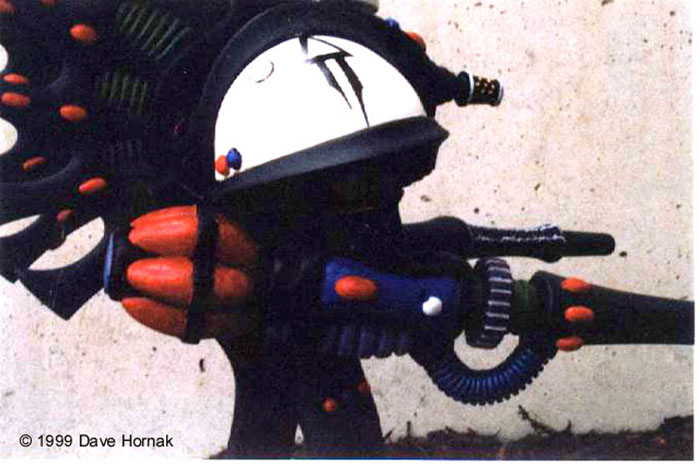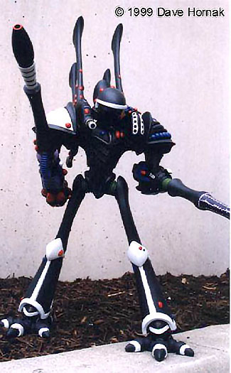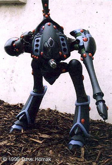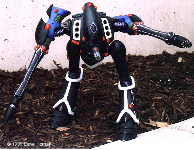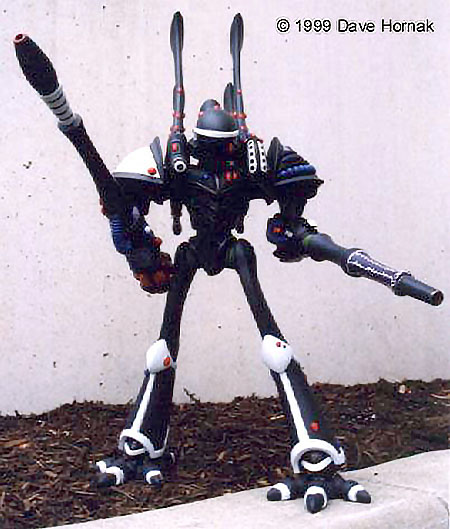 ![]() These shots are of the Eldar super-heavy weapons, sculpted by Armorcast from the designs seen in the Warhammer 40,000 games by the British-based Games Workshop. Cast in polyurethane resin, the Eldar are one of the player-species represented in the quest for universal domination. The first weapon is a Phantom class Titan, standing around 22 inches from feet to wingtips. The main armaments are the multi-shot super-heavy pulse laser on the right arm and the heavy heat lance on the left, both with a firing range that can easily target and destroy enemy tanks or fortifications. Secondary weapons include a single-shot lascannon and a 10-tube missile launcher. The second mech type is of the Revenant Scout class, with one missing the rear jumpjets. The Scouts are equipped with dual multi-shot pulse lasers and a six-shot troop-killing scatter cannon located under the pilot's compartment, which is also flanked by 3 missile bays. Both classes are very nimble, and are protected from enemy fire with a sophisticated holofield, which breaks up the Titans' visible image into tiny shards of light, effectively making it difficult, if not impossible, to hit the unit. I chose the darker color scheme for my Eldar for a couple reasons. Games Workshop said all Eldar favor bright clean colors, but I'm usually partial to the darker, menacing schemes, with only the crystals adorning the body having any kind of glossy sheen. Plus, this "clan" of Eldar society is driven overall by a burning hatred and revenge over what its fellow clans have endured (you have to play the game to fully understand) and I wanted the colors to reflect that emotion. |