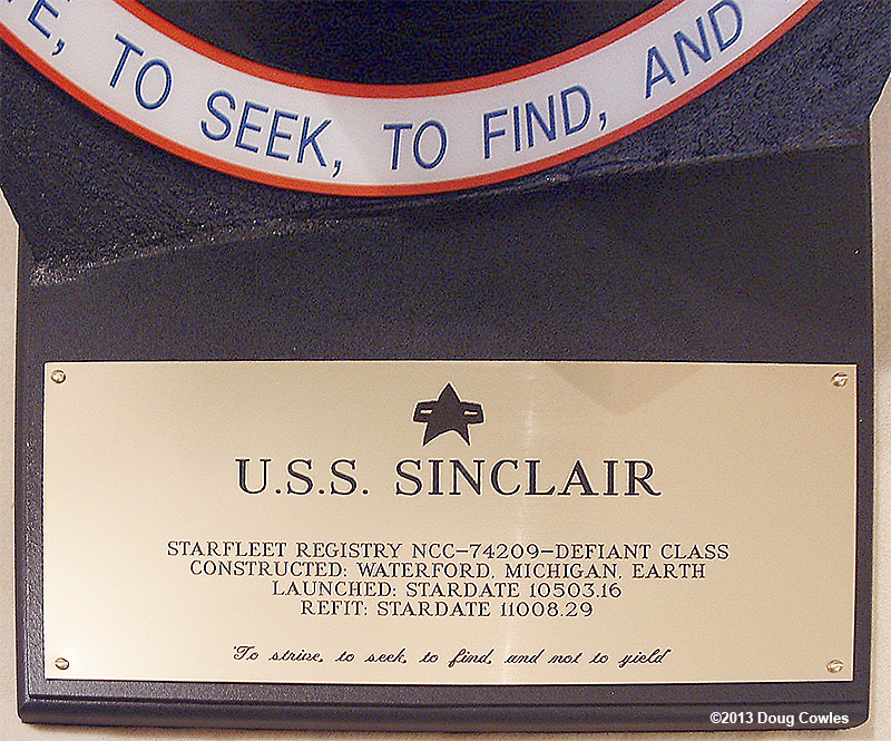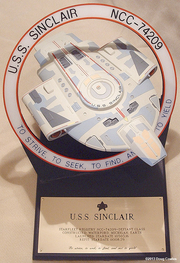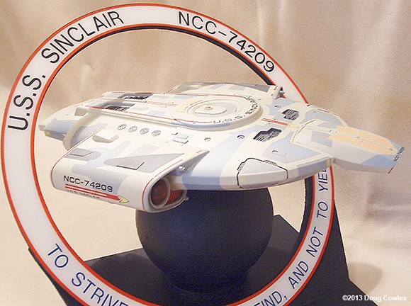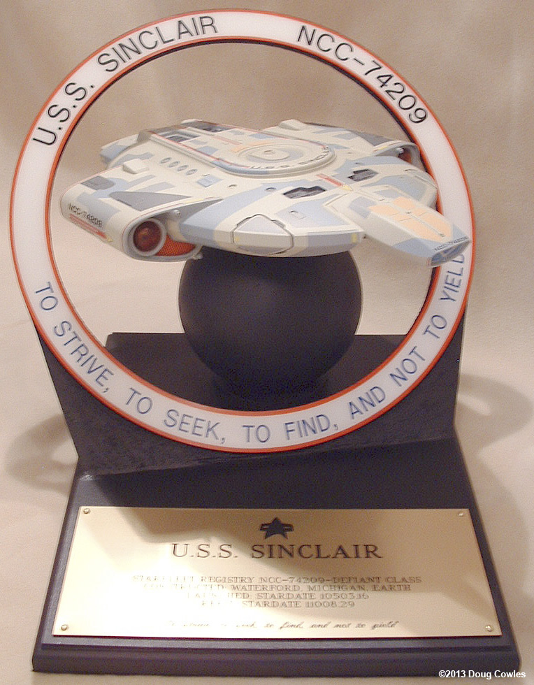 I recently completed the attached USS Sinclair display for a local Star Trek club here in Michigan. It's the old AMT/ERTL Defiant model with some modifications and custom decals from JT Graphics. The club wanted it pristine so there's no weathering - which is harder to accomplish than one might think. You can cover myriad sins in the name of weathering! I decided to depict the club's logo, which I've included a picture of as a reference, along with a dedication plaque. The model is mounted on a ball to provide the necessary stability to keep it from banging into the ring and to fill the empty space below and behind it. It was a fun build and I hope everyone likes it. Image: Front Image: Logo Image: Plaque |