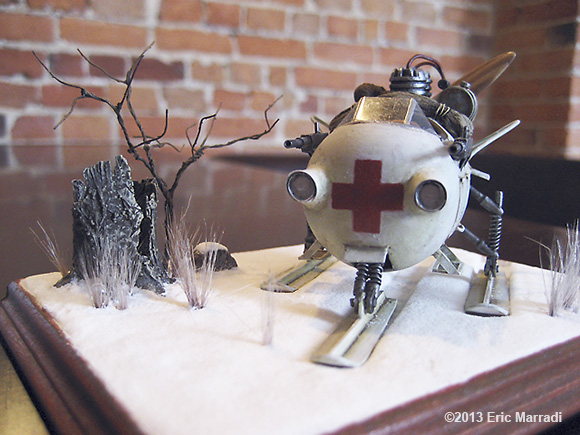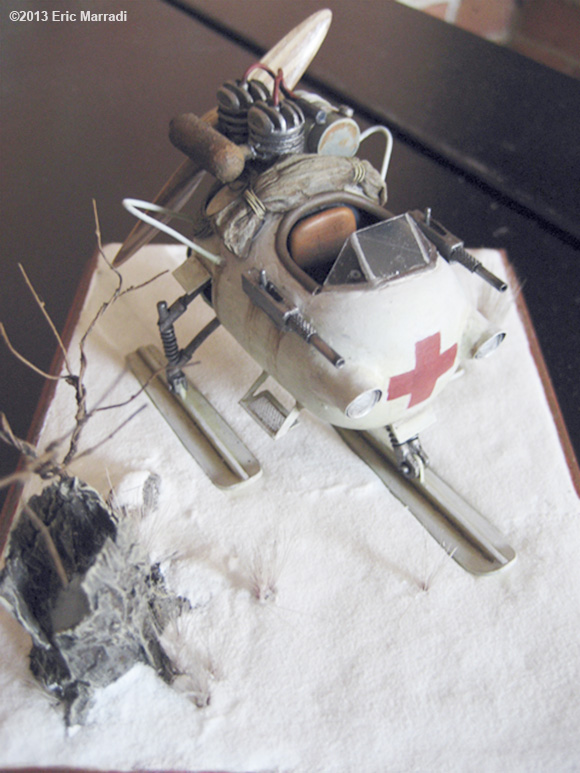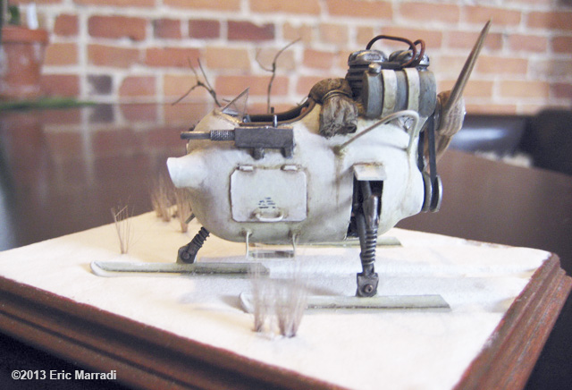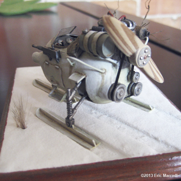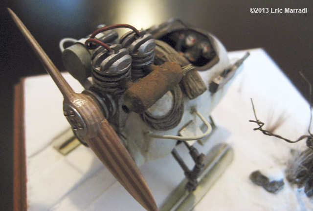 This model was scratchbuilt using yellow plastic kinder chocolate eggs. It's inspired from the NKL 26. The propeller is layers of 1mm thick wood (maple and cherry). The tree trunk is aluminium foil, the belt is paper and the tarp is paper tissue. Every thing else is either ABS sheets or copper pipes. This is definitely my best ride to zoom on the frozen lakes of Quebec ! Image: Cockpit Image: Left Image: Rear Right |