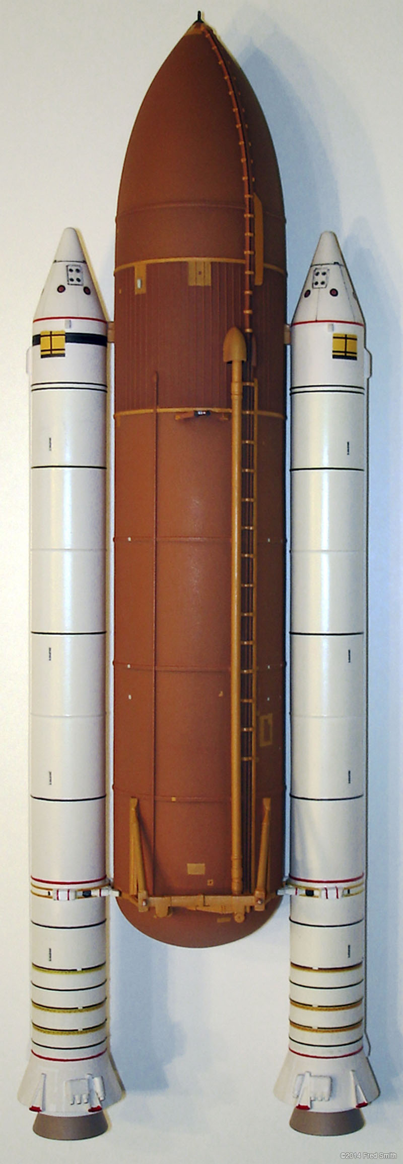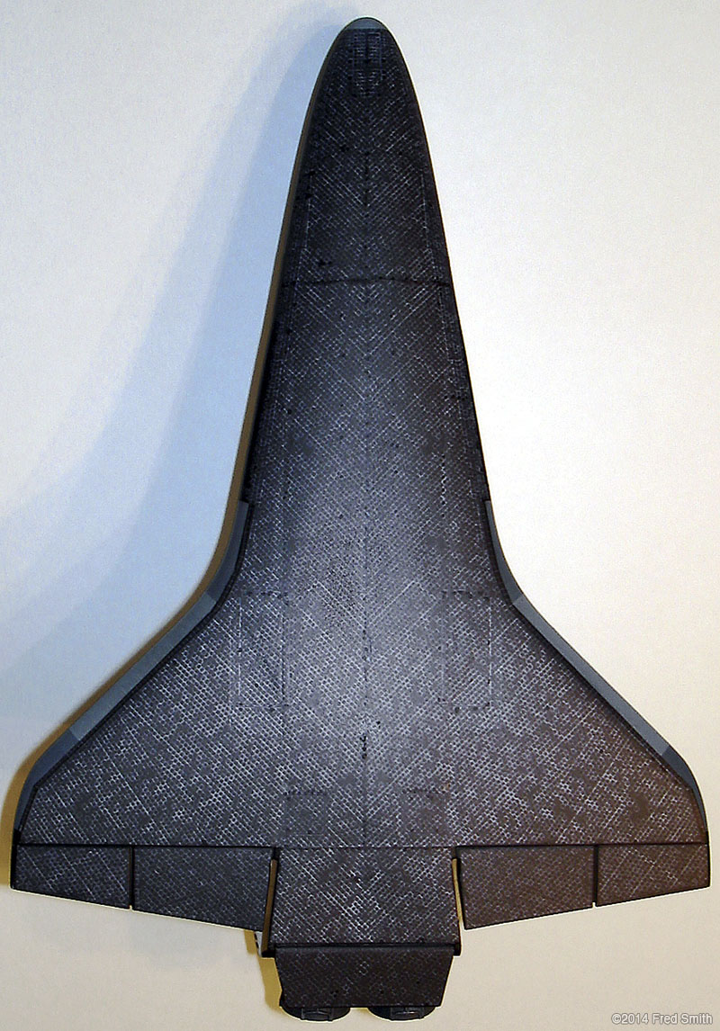 "Bring my shuttle". This is a 1/144th scale model of the Space Shuttle Discovery with SRBs and External Fuel Tank, built pretty much, right out of the box from the Revell kit. I decided to add brass wire manifolds to the kit's main engine bells for a little more detail and accuracy. Also added two aft RCS thrusters next to the existing ones. I also changed the position of the lower separation thrusters on the SRBs. I used a combination of the kit decals, some online patterns and some custom decals for the heat tiles and various panels and texture. I also made a custom base / stand commemorating the Shuttle Program. You can see more pictures on my website: www.siriusreplicas.com. Image: Adding nozzle detail Image: Shuttle Tiles Image: Tank and SRBs |