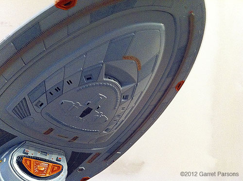 This kit was built ten years ago to see if I could reproduce the exact colours of the studio model, not how it looks on TV. The kit out of the box wasn’t bad, but not accurate. I had to decide what was worth changing and what wasn’t. The basic shapes were off but not enough to change. Lifeboats were added and the forward window was enlarged as was the two side bridge windows. I spent hundreds of hours adding tiny slats to the phaser strips to correct them. After reviewing the color instructions of the model it became apparent they were way off. I decided this was were I was going to focus all my efforts (paining is my thing since I had been an illustration artist) and paint the model not like you see it on the TV screen but paint it like they painted the studio model. The problem was I had no photo’s of the studio model and there were no pictures on the Web at the time I built this model. So I contacted Rick Sternbach from Paramount Studio’s. Rick was the art director for the Star Trek franchise at the time. He actually went to the studio were the model was and took pictures for me and sent me an email with colour chips to show me what the colour actually was. He used a system called the "Pantone Matching system." So the colours you see on this model are very accurate. Image: Bridge Image: Hull Image: Neck Image: Saucer Image: Saucer Right Image: Underside |