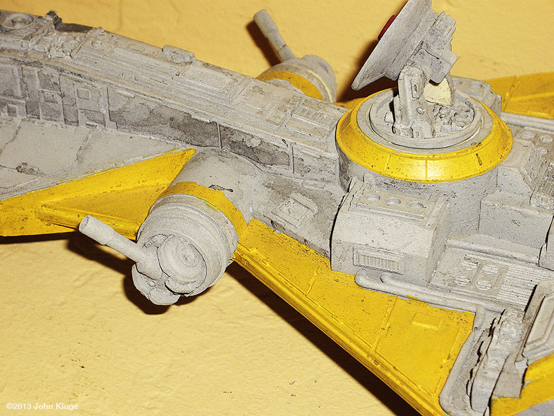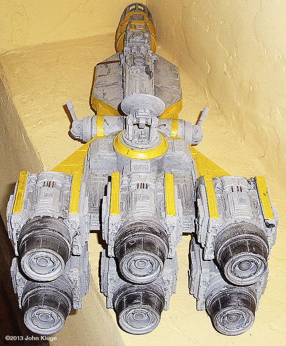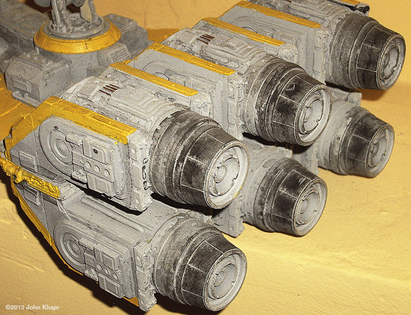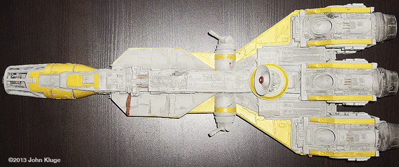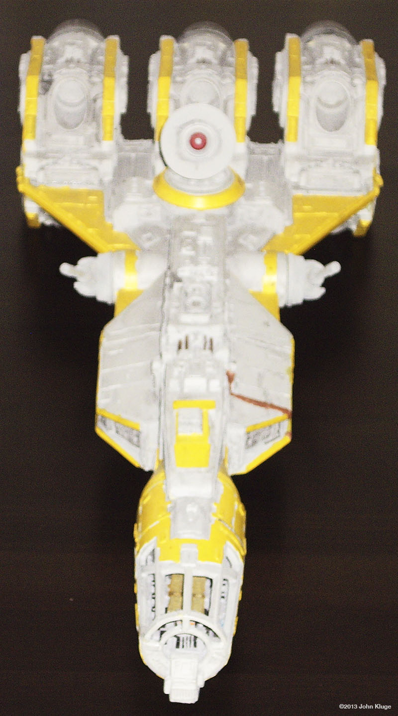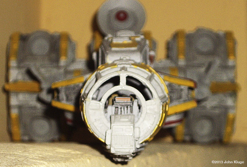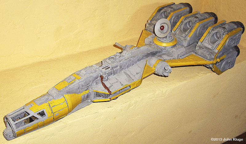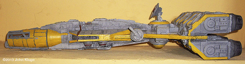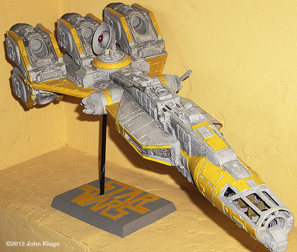Here are pics of my completed Corellian model from Randy Cooper. I purchased this model a few years ago from Randy Cooper Models. This ship is the first design concept for the Millennium Falcon. From the stories that I have heard, this ship did not look "Han Solo" enough so they scrapped the design and went with the disk model that we all know and love. Just because they scrapped it for Han however does not mean that they got rid of it. Take the cockpit off and place it across the bow like a hammerhead shark and you get the beginnings of the blockade runner. This is my first solid resin model and there was a lot more hacking then there was sanding. The one drawback is that there was no cockpit window(s) I tried just about everything I could under the sun but could not get perfection so I went without the windows and hope that the driver can hold his breath a long time. The turrets and the communications dish are held in with magnets. The Hull is a light gray and then I went with two coats of Insignia Yellow. I like yellow ships and do not see enough of them these days except Anakin's fighter in Episode 3. The finished product looks nice but it is heavy. It suffered a fall from a high shelf and shattered off the engines as well as the cockpit but thank goodness for crazy glue. Just something to think about when you mount it. Image: Antenna Image: Cockpit Image: Cockpit Image: Cockpit Image: Engines Image: Engines Image: Front Image: Turret Image: Detail Image: Rear Image: Front High Image: Front Left Image: Right Front Image: Left Image: Top |