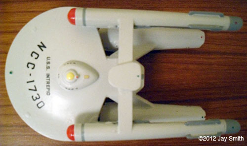 This is the USS Intrepid, a Newton class starship. Its design is based on one of the starships seen leaving Spacedock in the movie Star Trek. The Intrepid is the flagship of Admiral Leon Nakaga, who commands the Third Fleet from Starbase 15. The ship was launched in 2269 and was originally to be given the name USS Osprey. It was decided that the ship would be re named Intrepid to honour the deaths of the crew of the previous ship. Starbase 15 was situated not far from the Federation border with the Gorn Hegemony and as such the Intrepid had the honour of hosting the first diplomatic meeting between the two sides. While Ambassadors from both sides negotiated for a formal treaty the Intrepid and its Gorn counterpart hung in space for three days, until without warning a Romulan Bird Of Prey de-cloaked over the two ships and began attacking. Due to its slower reaction time the Gorn cruiser took severe damage but was able to return fire. The Intrepid was able to quickly manoeuvre itself as the Romulan ship appeared and only took minor damage to its starboard engineering section It was able to turn rapidly and fire off a fierce volley of torpedo’s, distracting the Romulan ship from its attack on the Gorn. As the Romulans moved in on the Intrepid the Gorn, who though damaged still had weapons capability, where able to directly target the Romulan ship with its disrupters. The Romulan's shields began to buckle and under repeated attack from both the Gorn and the Intrepid the Romulans fled the scene as quickly as they had appeared. While negotiations between the Gorn and the Federation had been going well, the subsequent battle had actually helped the two sides form a deeper appreciation of each other and was a major factor in helping to form a lasting bond between the two sides. Image: Bottom Image: Front Image: Left Image: Rear Image: Top |