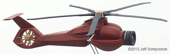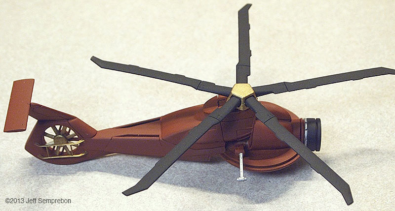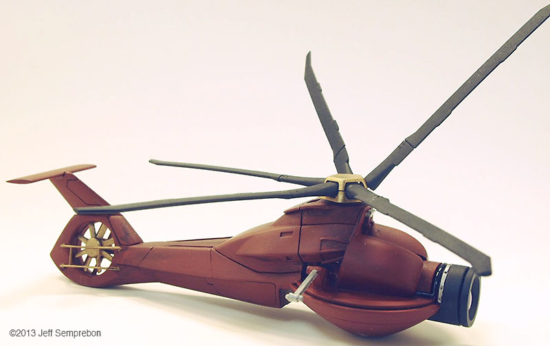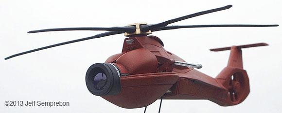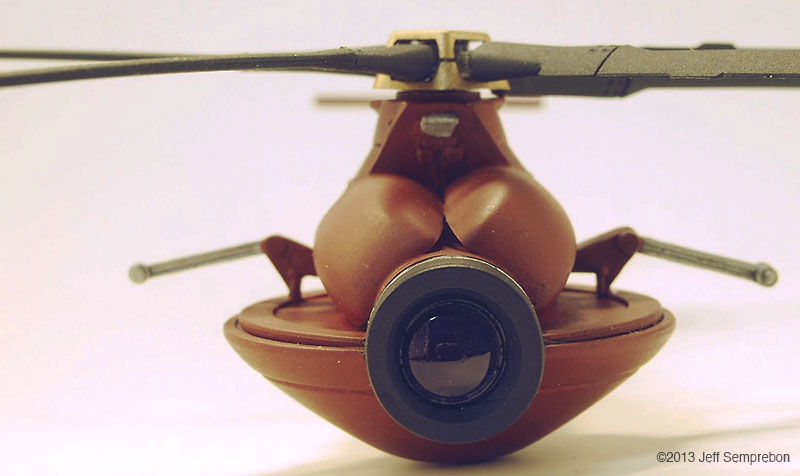 Having a need for a surveillance drone model for a photography project, a search of available parts on hand revealed an Italeri/Esci 1:72 RAH-66 Comanche missing its cockpit (which had been cut off to be mounted on a 1:48 Votoms mecha for another project) and a 1:6 scale Star Wars Pit Droid toy made by Hasbro for their line of 12" Star Wars dolls errr.. action figures. The Comanche rear fuselage was built stock, with rotor and trim parts sprayed flat black or gold before assembly. A piece of corrugated styrene sheet pained black was used to fill in the exposed gap in the lower fuselage that would result (which not visible in any of the photos). The Pit Droid was decapitated by driving out the wire pin on which the head pivots, and the unconvincing clear plastic front lens was sawed off. The two soft plastic antennae were carefully sliced away with a knife; the soft nature of the plastic appeared likely to cause problems with sanding. The eye socket was given a conical tapered interior with a deburring tool intended for dressing the rims of brass cases when reloading ammunition. A conical-surface bit for a router or motor tool in a hand-rotated chuck would likely work as well. A half-piece of tubing the same diameter as the eye was notched to fit behind the eye to continue this contour back to give the eye a bit more substance. Plastruct's PlastWeld cement worked sufficiently well to secure the styrene part onto the relatively soft plastic of the droid head. At this point, the Comanche fuselage was notched and carved to fit onto the inverted droid head, and a slanted bulkhead was added to close the front where the cockpit had been removed and add additional surface for joining the parts. The two assemblies were then secured together with PlastWeld cement. |