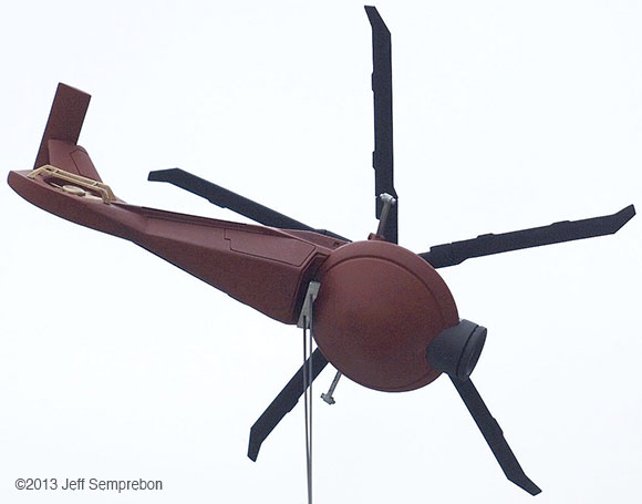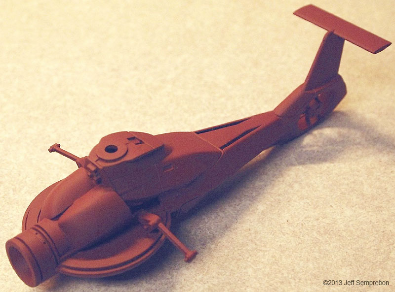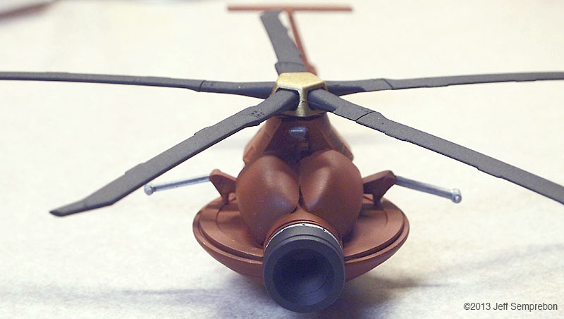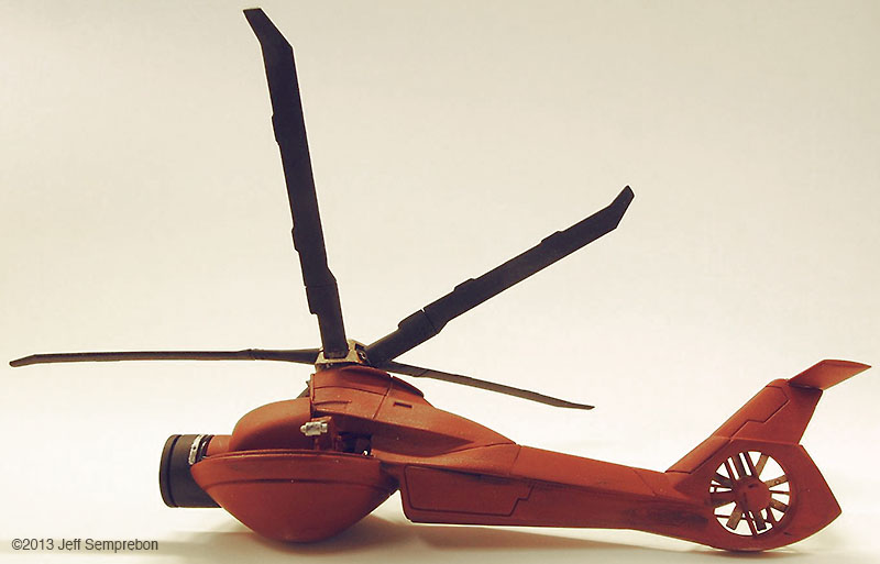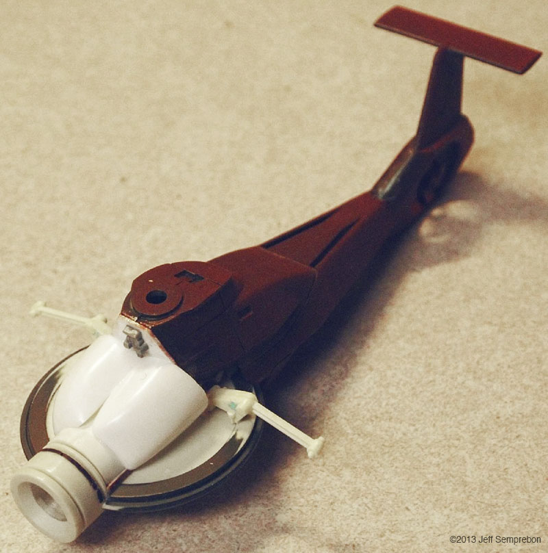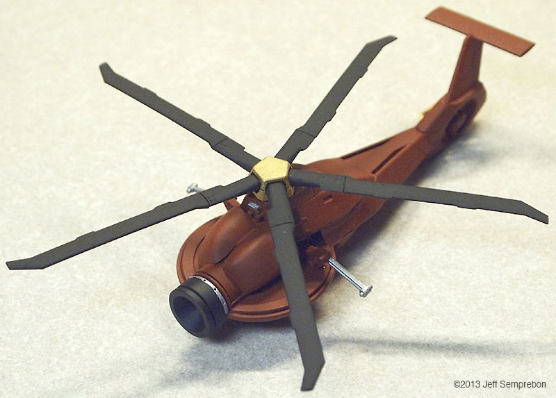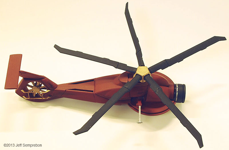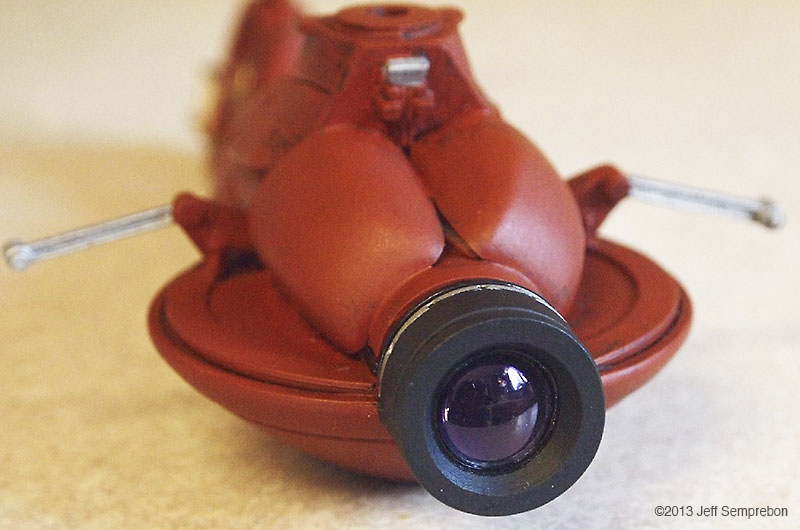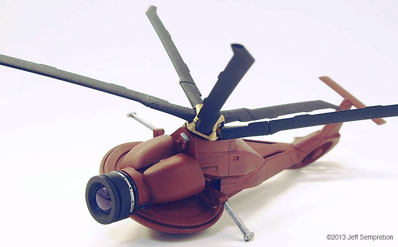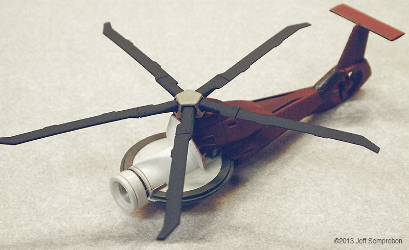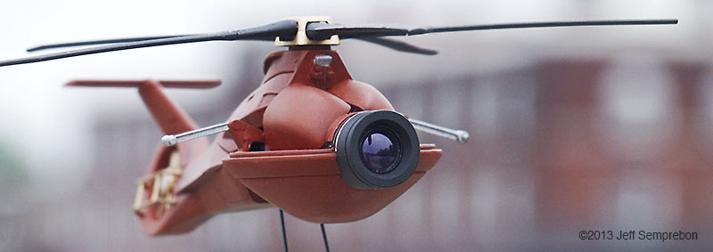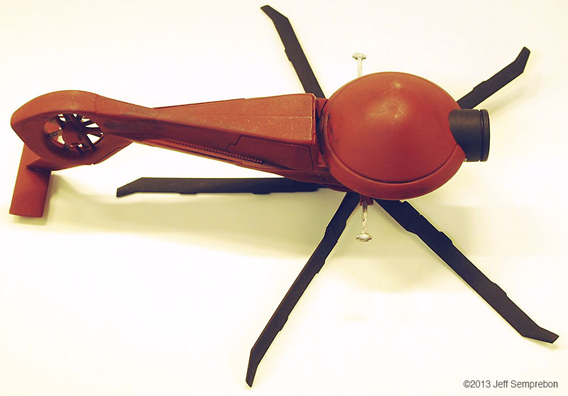The head looked a bit sparse, needing more bulk to house the presumed equipment to operate the camera eye. After dry-fitting various parts, a couple of 1:200 Space Shuttle Orbiter engine fairings were selected. These were sanded to fit against the eye cylinder and then cut at an angle to rest against the bulkhead. To add a bit more of an insect-like look, a couple of silver-painted greeblies were attached sticking out the sides. I believe that these were part of the brake gear of a 1:25 Matchbox Freuhauf tank trailer. Another piece from the scrap box was used to fill in the blank spot at the top of the bulkhead. The resulting assembly was sprayed with Krylon red oxide primer. Once the base coat had cured, all but the camera portion were masked off and the camera sprayed flat black. After touching up some details with brush-applied silver paint, the body was given a (rather sloppy) dark wash. Since the camera eye is the focal point of the model, I wanted something particularly transparent looking for the lens. The lens was cut from a 'googly eye', a plastic eye craft item consisting of a white background sealed to a shallow clear dome, with a black plastic pupil rattling around inside. These are available at craft stores, but if you know anyone with children in daycare or kindergarten, they frequently can be salvaged from art projects (like foam shapes, glitter, and colored feathers, daycare providers love to have the children glue these 'googly eyes' onto their projects to make the paper harder to recycle). The clear dome was cut off from the white background around the perimeter, using extreme care as the rounded shape made it difficult to get a grip, and required moving the knife towards one's fingers. Once free, the clear dome was given two coats of clear acrylic finish ("Pledge with Future" brand flooring finish) which had a small amount of purple acrylic paint mixed in to give the appearance of an anti-reflective lens coating. The lens was then set in place and secured with an additional application of the clear acrylic, and the model declared complete. For "in flight" photos, an ungainly construction was formed of two lengths of piano wire held apart by a drilled styrene strip at one end and inserted into a small block of wood at the other. The wood block was fitted with a 1/4" x 20 T-nut to allow it to be mounted to a conventional photography tripod to support the model at the desired angle. The wires fit into small spaces between the droid head and the helicopter fuselage, and will eventually be removed using digital processing in the final photographs. A final modification was made after the rotor blades (never secured to the fuselage) had been dropped a couple of times. Simply gluing them back on proved to be insufficient due to the small surface area available, so the two blades currently broken off were reattached with strands of copper wire dipped in CA adhesive and then inserted into holes drilled in the hub and the base of the blade. This allowed the blades to be bent for a battle damaged appearance (perhaps after the drone met with a large flyswatter). Assembly Image: Front Image: Lens Image: Parts Image: Base Coat Final Image: Blades folding Image: Bottom Image: Left Folding Image: Lens Image: Front Image: Front Left Image: Front Right Image: Left Folding Image: Lens Image: Right High Image: Top |