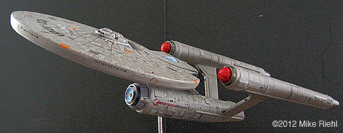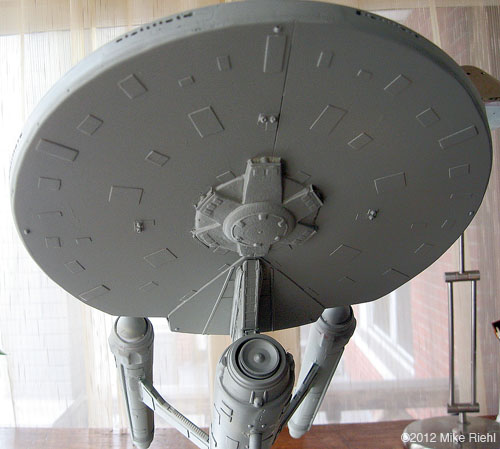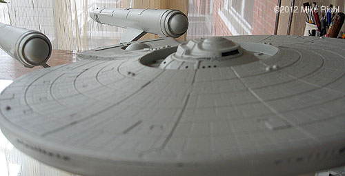 The engine pylons were also scratch built and cut low so it gave my Enterprise a sleek look. The were slanted slightly and then towards the top of the nacelle notched forward. I added some "hull plating" from sheet styrene here and there and on the entire model and acheived the desired look. The bridge was taken from a Reliant model. The model was painted in a darker grey and "dirtied up" so it would appear used and could have been part of the fleet that met its fate at Vulcan. I used a a variety of decals to created the ship's hull registry. The model is 23 inches long, 1/537 scale. I named the ship one of the "Liberty Class Starships" the predecessor of the Enterprise in the movie. I take it to conventions and the response is very kind. This model is a great addition to my Enterprise collection and I am very pleased it turned out the way I wanted ..so go down that dark modelers' path it's not to dangerous. Image: Top Image: Saucer Image: Front Image: Rear Image: Saucer, underneath |