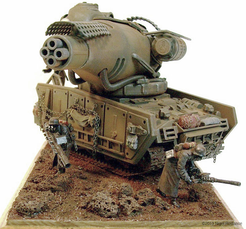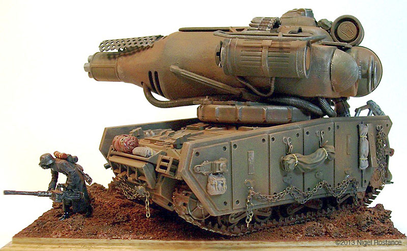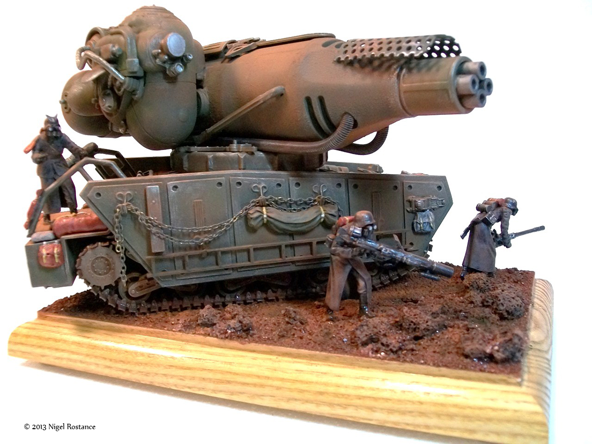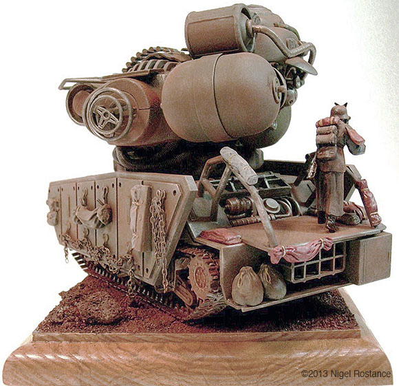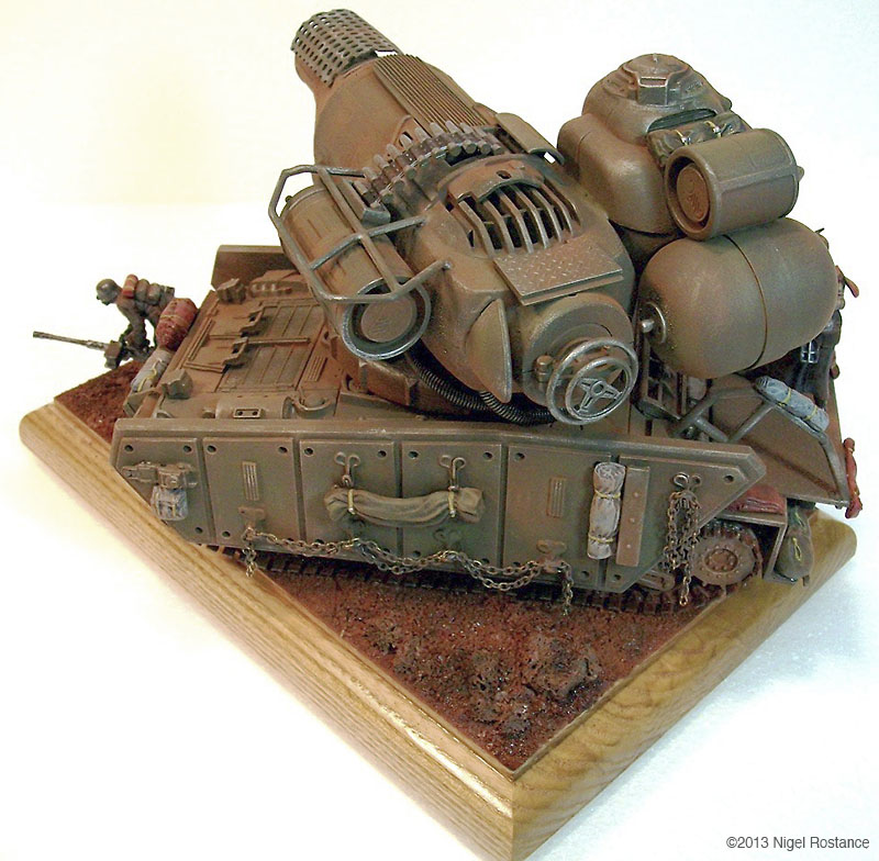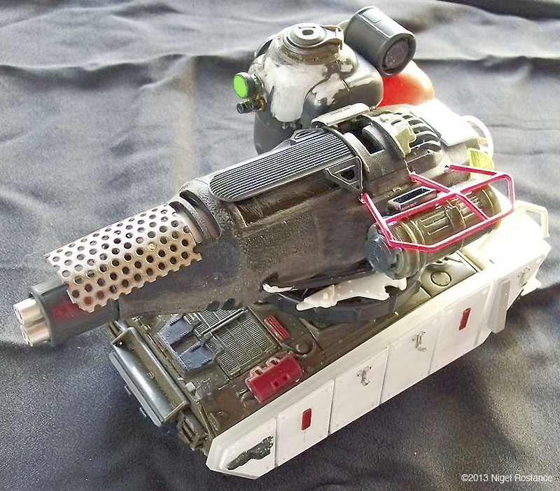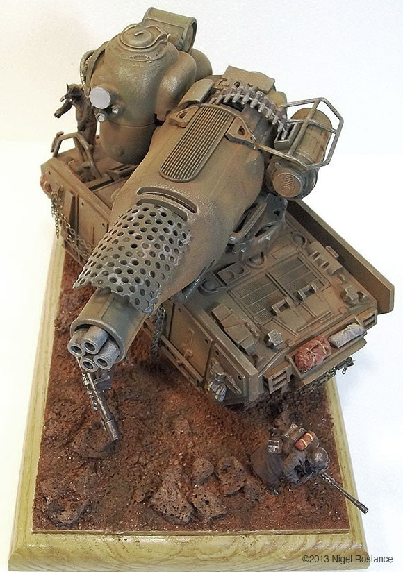 This latest model was cobbled together from whatever was not secured down! It was basically made out of three major components; a retired Dorvack mech, a Sherman tank base, and the housing of a dead Dremel. All other bits and pieces were scrounged from the many parts boxes (as well as the inclusion of the traditional KinderEgg; I don't know why I started that...) The only "built" parts are the side panels. Everything else is very basic and routine model construction techniques. I envisioned a tank not built from any iron-based metals, so no rust this time. I figured since it was going to be on Mars anyway, there would be enough rusts and burnt sienna for the weathering! I used basic military green for the base colour, and dry brushing on steels and metallics for wear. The only purchased parts are the Tamiya figures, which were modified for the environment, but based on the recent film "Iron Sky". the base was made from scenery material (gravels and sand) with lava rock, then dusted with various shades of pastels. The tank was also heavily dusted with the same materials. No back story for the model, but the name should be recognizable to all. Image: Larger view Image: Front Left Image: Front Right Image:Left Image: Parts |