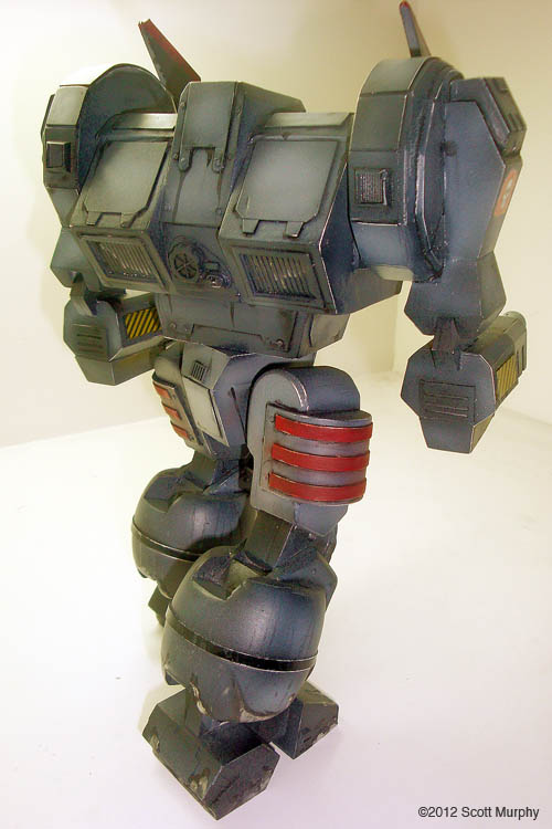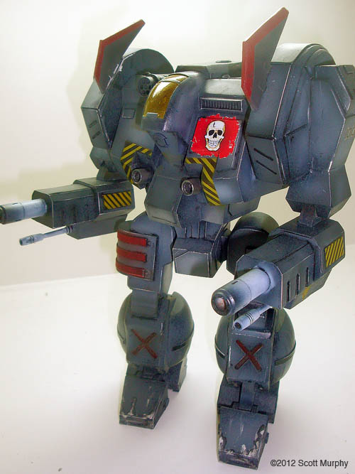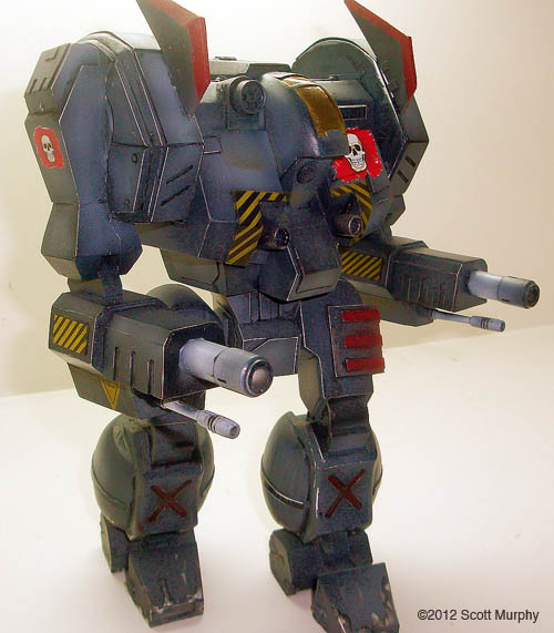 This is my scratchbuilt 1/60 Battletech mech, the Templar. It's painted in the Grey Death mercenary company's usual grey-on-grey colour scheme. I built this mech to be in scale with the old Armorcast mechs, the Atlas, Madcat and Vulture. It stands about 8 inches tall. To build this mech I started with the paper plan available on the net which are from the Mechwarrior 4 video game. The paper plans really speed up the process. Where I used to spend forever drawing plans, trying to figure height and proportions now I can just print up the paper model pages cut it out and transfer it to styrene. |