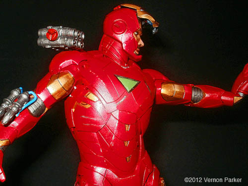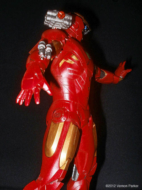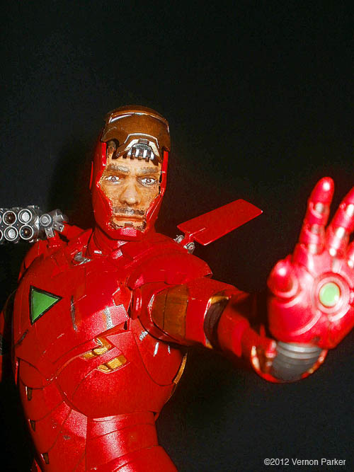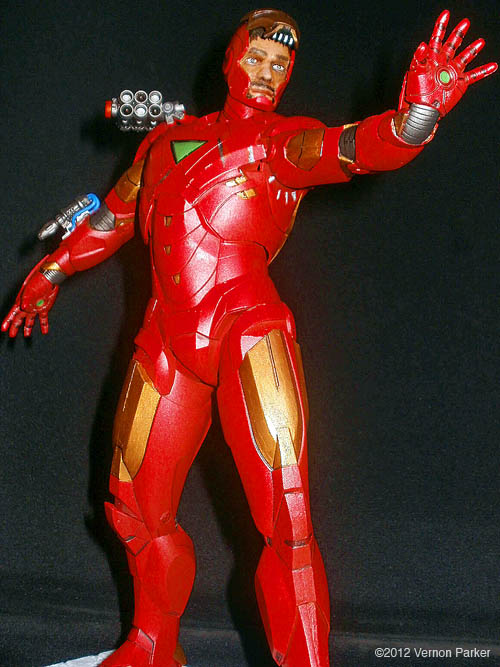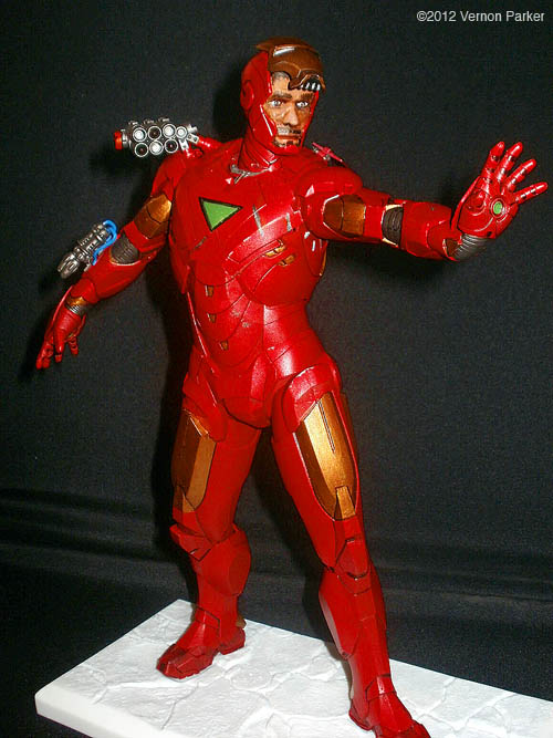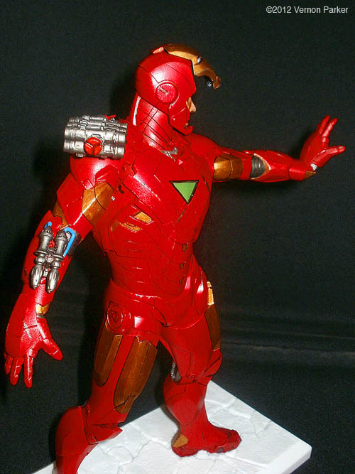 After seeing the new Avengers movie, I set myself the daunting task of creating the Avengers in model form (it would help if they were all available wouldn't it - doh). First up - Iron Man. Moebius' Iron Man Mk VI is a cool kit, and looks great straight out of the box. It's 1/8th scale so builds to around 10 inches high, with lots of seperate and overlapping armour so it can be detailed and painted up very nicely. I wanted to add some additional detail, like the 'pop-up' weapons he has on his wrist and shoulder, some airbrakes and most importantly - A FACE. I guess the biggest issue I had with the kit is that the helmet has a seperate mask - but there's no face behind it should you wish to display the figure with the helmet open. For the weapons I used some spares I've collected from Games Workshop kits, scratchbuilding the mounts and other details from various spares, sprue and bits of wire. I cut away parts of armour to mount the weapons sub-flush, but I'm not sure the amount of work this took really shows though. The airbrakes are made from aircraft kit spares; I think they are from and F-14 with some scratchbuilt mounts that enable the brakes to be moved. For Tony Stark's face - I had a Captain America kit that comes with 2 faces. A bit of trimming to make it fit and a painted -on goatee and presto - we got a face. This also allowed me to detail the inside of the Iron Man mask as well although this is virtually impossible to see on the finished kit. I painted Iron Man with automotive primer and cherry red rattle cans, then brush painted the gold and metallic section, and added a bit of battle damage too. This model will eventually fit into a planned diorama with all the Avengers characters - although it will be huge! Image: Face Image: Right Image: Right Front Image: Visor |