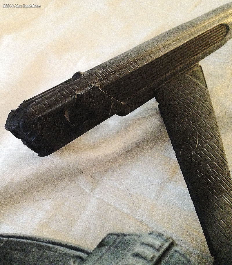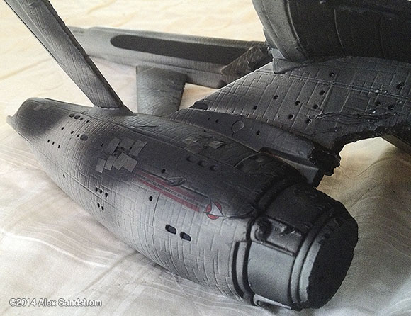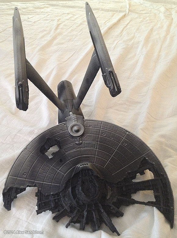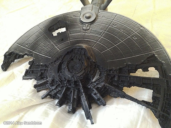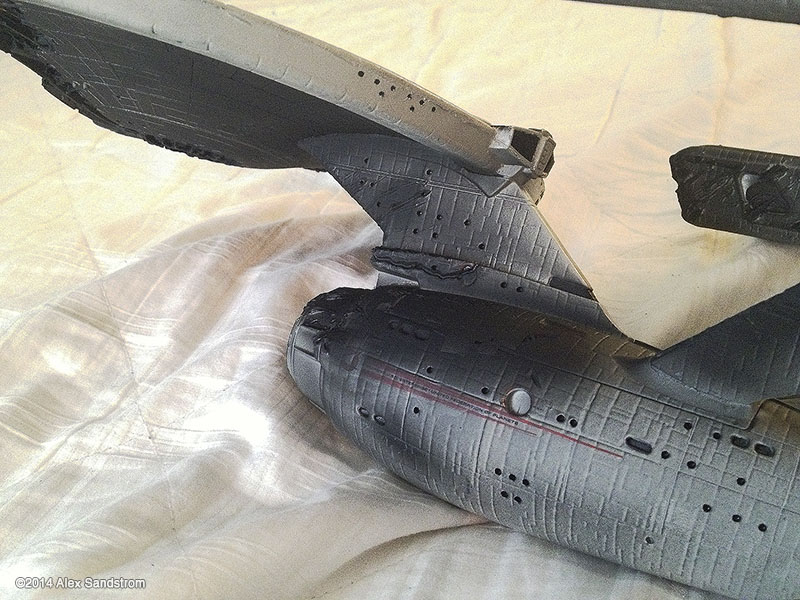 I know that others have completed this model before, however I wanted to share my take on the damage inflicted by Khan and the self-destruct. The base model is the AMT/ERTL 1/537 Refit from Star Trek VI. I wasn't too hung up on the accuracy of the model in terms of Enterprise vs Enterprise A, but I did modify the decals to eliminate the -A so it could pass for the version from Star Trek III. The saucer section is a resin kit purchased online many years ago. I don't remember where it came from, but I have seen others on this site use it so I am sure it is not too hard to find. It came with some "battle" decals which I promptly discarded as I thought they looked fake. I started with an assembly of the secondary hull with plans to paint in colors that I find provide a nice balance between the studio model colors and the colors seen on screen. I used Model Master Gloss Gull Grey FS 16440 and Aircraft Grey FS 16473 to generate the grey and blue shades, giving a distinction between the two without the blue looking too blue as to be distracting. Before the model was even primed, I inflicted damage to the secondary hull by using a soldering iron and "impacting" on the damage areas. This provided a nice deformation of the plastic and also allowed me to generate the scars on the port side caused by Khan. The completed model was covered in gloss coat to give it the original beauty, before layers of dull coat and flat black were applied from the front towards the back. This not only generated the burnt look, but dulled most of the model while leaving surfaces such as the underside of the shuttle bay mostly untouched and glossy. Overall I am pleased with the final product and even got a compliment from my wife - which I felt was quite an achievement. Image: Engineering Hull Image: Right Nacelle Image: Left Nacelle |