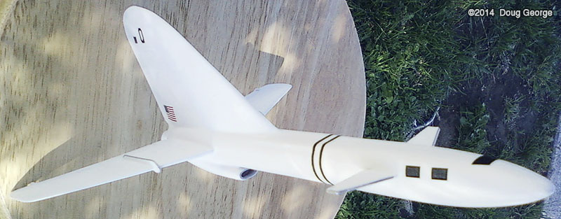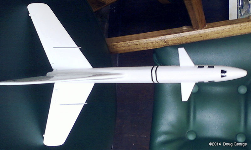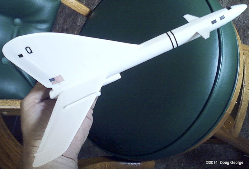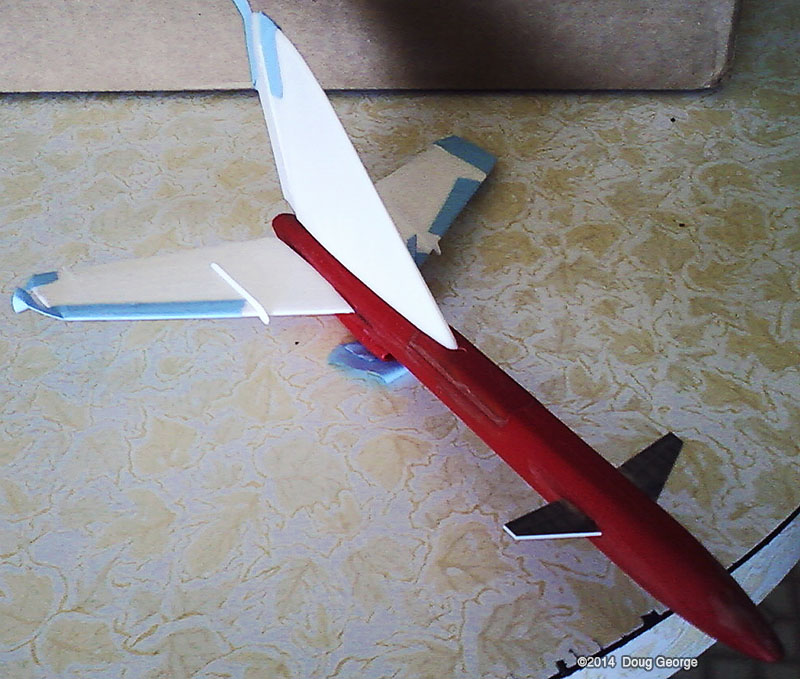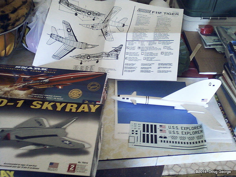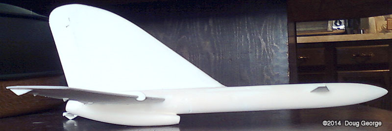 Several years ago one of my friends interviewed an animator for the old Jonny Quest show. Knowing I like to build, he asked me for a prop to take with him. I immediately went to my model closet and pulled out two Lindberg models, the F-11F Tiger and the F4D-1 Skyray. I also located an old Revell Snark and the decals from the Lindberg Star Probe. I cut up some plasticard for the canards, assembled the F 11F Tiger wings normally (elevators work!) and used the tops of both the Skyray's wings to form the tail. I then applied bondo and sanded, primed, and painted with rattlecan gloss white. It was a fast and easy weekend build, and a lot cheaper than the then available resin kits. Image: Bottom Image: Front Right Image: Right Image: Top Image: Donors In Progress Image:Exhaust Image: Front Image: Rear Image: Rear Left Image: Rear Right Image: Top Front Image: Left Image: Top Left Image: Left Image: Right |