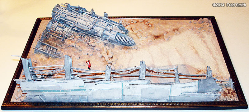 There is an interesting story behind the construction of this 1/72nd scale Y-Wing diorama. The fighter was built out of the box from the Fine Molds kit. This was my first model from Fine Molds and I must say I was very impressed; a truly well-engineered kit. The model was airbrushed light gray and then weathered with pastel chalk after applying the decals, and then sealed with crystal clear flat acrylic. I used the kit decals, but mixed and matched for a non-movie version, and used most of the remaining decals on the derelict crash site. I began the crash site by gluing the vacuum-formed base from the old MPC Hoth set to a piece of doubled 1/8" plywood. The derelict's main structural members are from two AMT Star Trek kit stands. I used various kit parts, sprue, tubing and wire for the engine and hull details. The engine bells are from failed casting attempts of my Nebulon-B Frigate - I hated to see them go to waste. The hull paneling is both card stock and plastic. I had some old Alumilite casting resin that was too thick and grainy to use for resin casting, but it made a great "rocky textured" paste to form the ground around the crash site. I used sand and small pebbles for additional texture. After priming with Krylon gray, I applied a base coat of Krylon flat white, and then used a series of both acrylic and enamel washes to get the desert tones as well as the crashed ship just right. Finally I mixed a little light grayish tan to some matte clear and airbrushed everything with a light coating of "dust". I thought the results were pretty good. There are a few more pictures at my website www.SiriusReplicas.com. Image: Back Image: Y-Wing front Image: Y-Wing top |