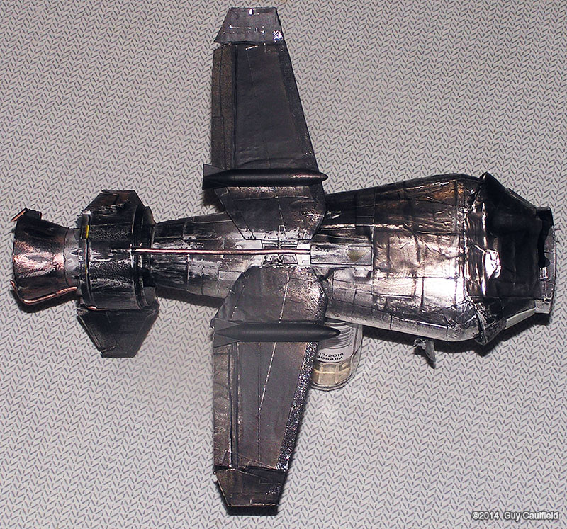In my defense, as a scratchbuilder, I spend a lot of time agonising over the aerodynamics and feasability of my models, which is why I added the tubular wing supports at the wing roots. And although this model doesn't have it, as I built it to be the post re-entry version, there should be a nose shield which is blown off during re-entry to allow the jet engines to spin up, which then give airflow stability, and aero-braking once the craft is in the atmosphere. I really think that the front section of the fuselage would generate quite a lot of lift, which is why the survivors decided to build the wings so far back. The Main thrust engine is heavy, and as such, although this craft made it to the end, it was always considered to a "controlled crash landing" undercarraige of any description, was considered too complicated, and pointless. If I ever find another salad dressing bottle I'd like to make the diorama of its landing, and or its rail launch. Image: Bottom Image: Bottom Front Right Image: Right Image: Rear Image: Top |