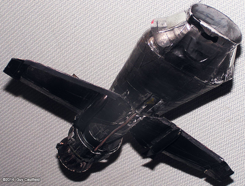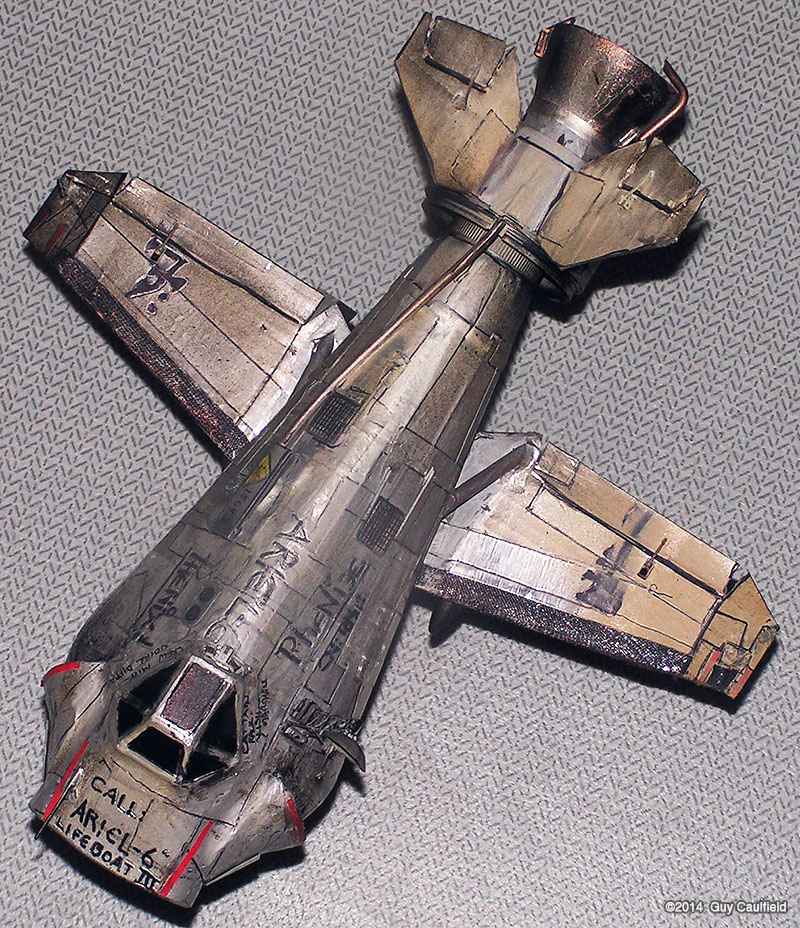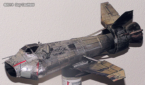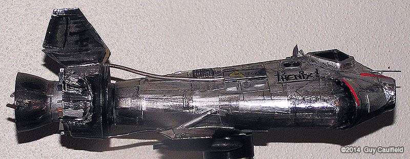 This model was built because I had nothing better to do for a solid, excrutiatingly boring, weekend. The idea is based on the idea of "flight of the Phoenix" in this case, it is a crashlanded starship crew that need to planet hop to be picked up by another ship. They build a ship out of one of the main lift engines, with a booster pack (not shown, I haven't built it yet) that gives them orbital escape and then a month of interplanetary range. As can be seen on the model, they have an old engine start firing system, one of which comes from the onboard generator, and the other as a flare which is on the rocket cone. All of the ship was "thrown together" in the story, from the remains of their ship, including the drop tanks and the jet engines in the nose section with ducted lift manoeverability for the 'eventual' arrival. As I remember, the crew was a mixed bunch of the courageous, naive and a coward. In my story line, they were all thouroughly hard core spacemen who knew that the only way to survive was to take a pile of scrap up through the atmosphere into interplanetary space, with only their working knowledge of the ship that they had served on, and the knowledge of aerodynamics and re-entry dynamics. In my story, they survive. Like in the two films. The model itself is made from a triangular salad dressing glass bottle of American origin, cardboard, straws, a medication 'bulb', some sprue; the motor is made from a piece of garden furniture. The whole thing is covered with aluminium sticky tape that I found, ubiquitous superglue, and some paint that I had left over. It got quite a bit of attention on facebook, which pleased me no-end, as that weekend was awful. In my defense, as a scratchbuilder, I spend a lot of time agonising over the aerodynamics and feasability of my models, which is why I added the tubular wing supports at the wing roots. And although this model doesn't have it, as I built it to be the post re-entry version, there should be a nose shield which is blown off during re-entry to allow the jet engines to spin up, which then give airflow stability, and aero-braking once the craft is in the atmosphere. |