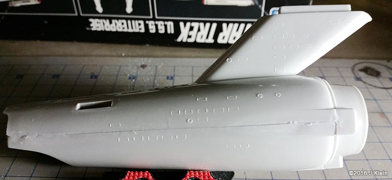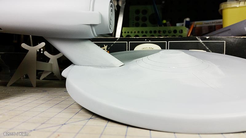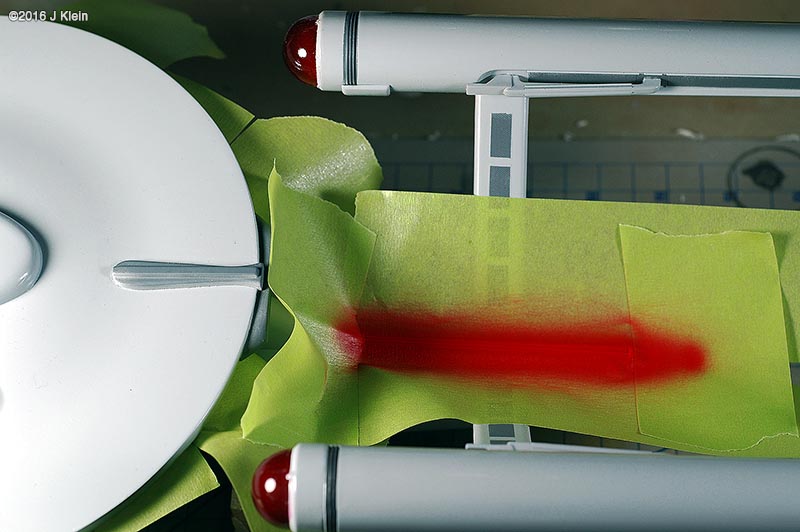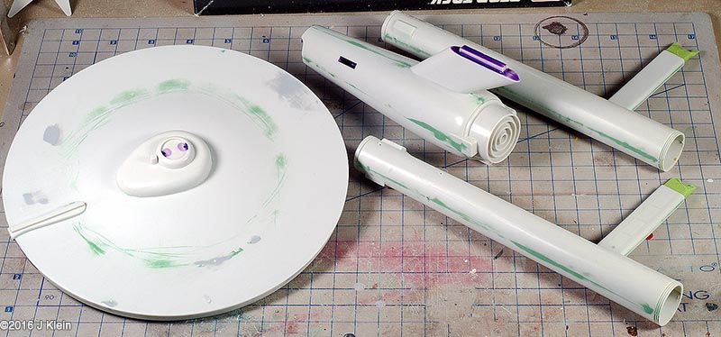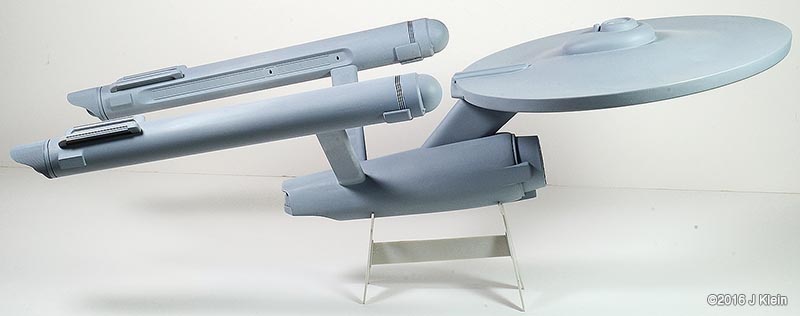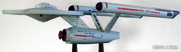 I got my hands on an old edition of the venerable 18-inch (1/537 scale)¯ Enterprise (no bloody A, B, C, or D); this is a re-release from the '90s put out by AMT/ERTL. Which way to go? There is always much debate regarding how accurate one wishes to make this model. The kit itself has some inherent problems, and then there are the weathered/unweathered, panel lines/no panel lines, light placement, bridge shape, restored/unrestored paint job debates¦ the list goes on. I chose to build mine to be accurate to what 8-year-old me gaped at on the television screen; also keeping it old school, I wanted to build this kit with a minimum of alterations. Sort of like what 8-year-old me built, only with the benfit of patience, experience, no tube glue, and an understanding of what modeling putty is for. |