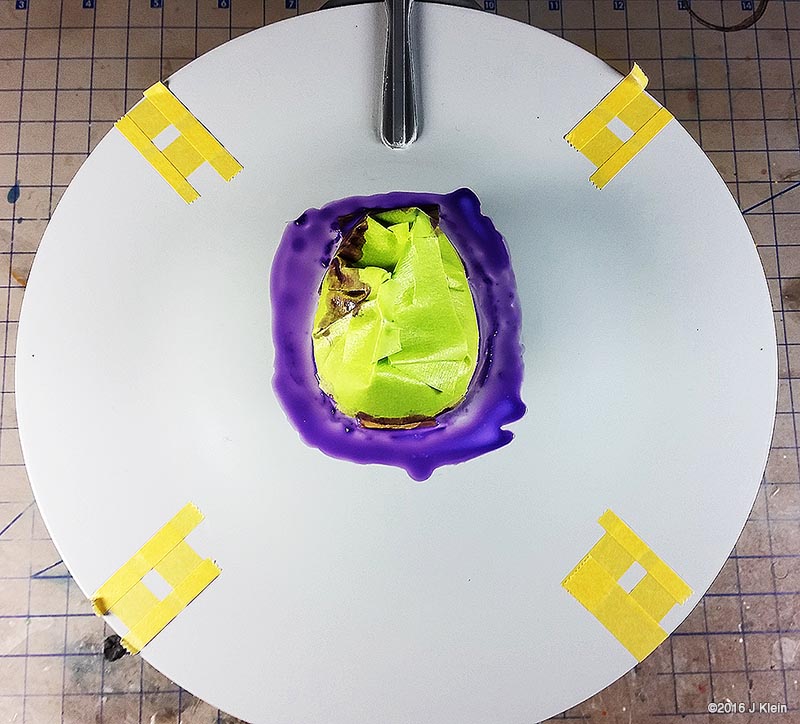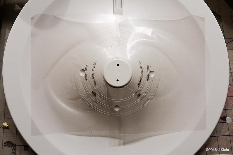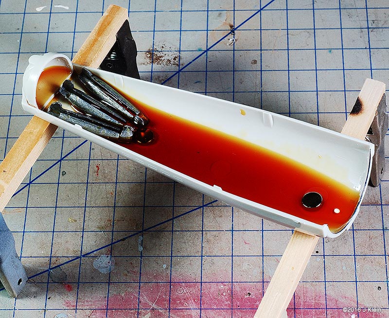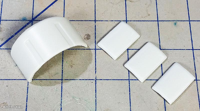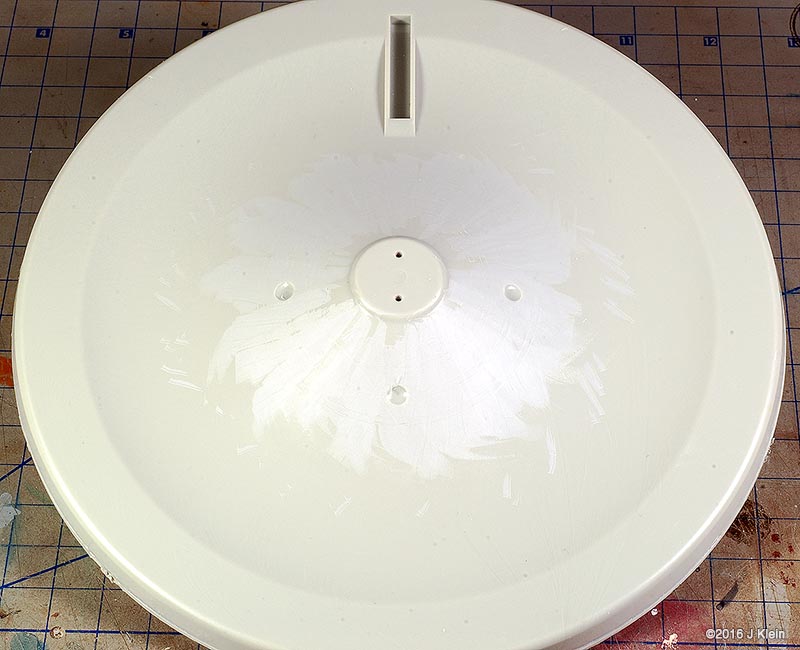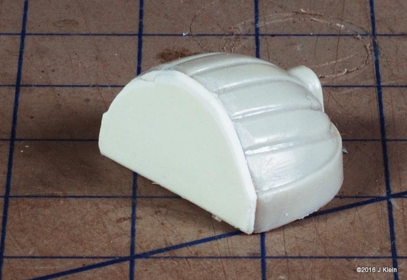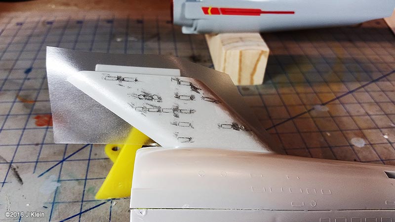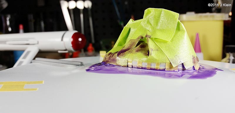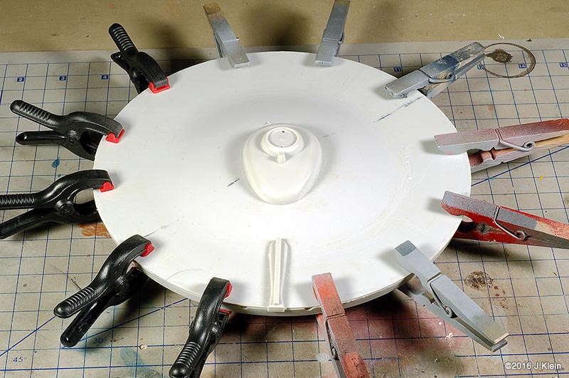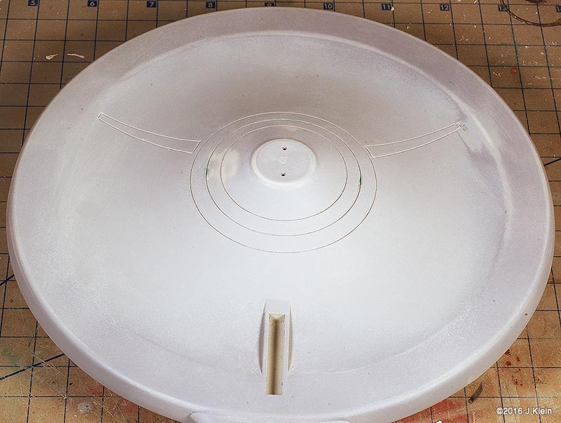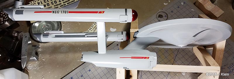 Basic Alterations I wanted to keep the alterations to a minimum during this build, so I only corrected a few of the most glaring faults with the kit. The biggest change was the removal of the raised panel lines and window detail. Whether they should be there or not, the raised panel lines on the saucer section are grossly out of scale so I sanded them off and rescribed concentric circles in their place. I also filled the three dimples on the saucer bottom (I believe earlier versions of this kit included a stand which registered into these depressions) and scribed the two triangular hatches found on the filming model. I also removed the raised window detail, but before I did, I used applied frisket film over the windows and rubbed it down with the side of a pencil to create a template for the windows. After adding a spacer between the upper and lower halves of the saucer to reduce flexing, I glued the halves together, puttied and sanded, and put it aside for painting. The main hull was treated in same manner as the saucer. Prior to sanding off the raised window detail, I made a frisket template so I could repaint the windows later. I also expoxied two magnets into the bottom of the hull which will be mated with a pair of magnets in a wooden base. Since I was already filling the bottom of the hull with epoxy, I also added some lead weights to the bottom front of the hull to get rid of the top heaviness of the finished model (the saucer outweighs the hull), and to move the centre of mass forward so the model is better balanced on the base. The hanger bay door at the back of hull seemed too short, so I shimmed the bottom with a piece of scrap styrene. This sub assembly was then glued, puttied and sanded. On to the engines; the kit provides a detail part for the bottom front of the engine nacelles which is terribly inaccurate. The actual detail is clearly three separate squares, each separated by a small gap. The kit part is one piece with a suggestion of a gap. I separated the kit part into three pieces with a razor saw and installed them individually. The front cap for the nacelle has no registration tabs so I added a few scrap pieces to hold the cap in alignment during gluing. I've heard that the nacelle support arms can droop over time, so I poured resin into the hollow arms to strengthen them. After final puttying and sanding, the engines and pylons were put aside for painting. Painting After joining all the sub assemblies together, I primed the model with Rustolium sandable grey primer and then applied several thin coats of Krylon ColorMaster gloss Pewter Grey from a spray can. This colour seemed a pretty close "on screen"¯ match and the gloss finish was a excellent surface for decaling. After everything had dried for a couple of days, I cut the windows out of my frisket templates, applied them to the model, and airbrushed Tamiya Dark Navy Blue to represent the windows. There was no decal for the two prominent red stripes on the main hull's spine, so those were masked and airbrushed. Several red and grey panels were also masked and airbrushed on various parts of the hull and saucer. The front engine nacelle caps were masked off and airbrushed with Tamiya Clear Red. The main deflector dish and the area behind it were airbrushed with Tamiya Copper. Decals I used the decals proved with the kit, and they are horrible. They are somewhat inaccurate, stunningly thick, and slightly yellowed. However, I decided to go with them anyway because I was going for a kind of homage to the version of this kit that I built as a kid. They went on without too much trouble, but there are better decals out there if you're going for a more polished look. Finishing After the decals were dry, I sealed everything in with a layer of Future floor wax and several airbrushed coats of Liquited matte varnish. I mounted the model on a simple wooden base with magnets hidden in two pegs which will match up with the magnets in the ship's hull, holding the model in place. Image: Box Image: Bridge Windows Image: Bussard Image: Caps Image: Center of Gravity Image: Clamps Image: Corrected Image: Decaling Image: Decals Image: Dimples Image: Gridlines Image: Hanger Doors Image: Shim Image: Hull Lines Image: Masking Image: Neck Gap Image: Primed Image: Sanded Image: Lower Saucer Image: Lower Saucer Markings Image: Upper Saucer Markings Image: Stripe Image: Weights Image: Window Masking Image: Window Templates |