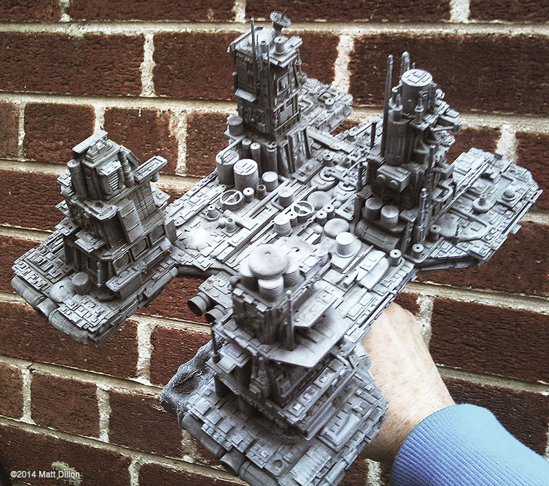 This is my scratch build of the Refinery being towed by the Nostromo from the original movie ALIEN. I used plasticard for the basic shape of the platform and built up roughly what the shape of the towers are. The recourse pictures I used were the ones we've all seen before; however, these vary from the studio model and the finished version on screen. After reading into the making of the original, I learned that the crew had completed the ship and refinery and it was covered in antennas and spires - almost cathedral-like. Ridley Scott came to view the finished masterpiece and shook his head. To the horror of the SFX crew he picked up a hammer and chisel and started knocking off all the finely detailed spires and antennas. The result was what you see on screen - the basic platform with the four towers at each corner minus the spires. Once I had made the basic shape I just began to build up the details using various household bits and bobs: Electrical fuses, paper clips, parts from cigarette lighters, wardrobe fittings, cable ties, buttons, etc. You name it and its probably on there. For the silo domes underneath I used Christmas tree baubles or different sizes, cut in half. Finally, once the basic shape was finished I covered it with tiny cut out squares of plasticard just to give it some detail. The ship looked like a pile of junk until the first coat of paint went on. Then the ship just appeared. I gave it a good weathering down and mounted it on the base. The base is a block of 3/4" MDF which I covered in string then paper mache to give it the look of the floor that the egg sits on from the movie poster. It's not the kind of model you can get any kind of exact accuracy - so I didn't even try. I just made a few sketches and conjured up the basic shape and tried bring out the feel of the movie version. Image: Bottom Image: Rear Right Image: Assembled Image: Paint Image: Top Image: Underside |