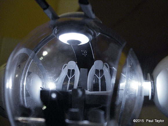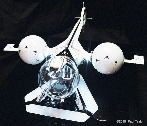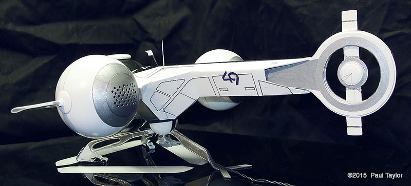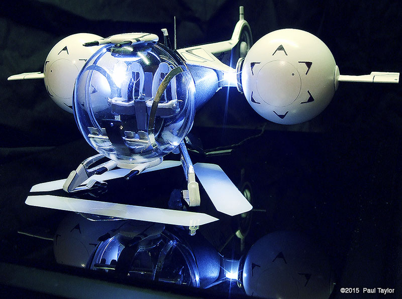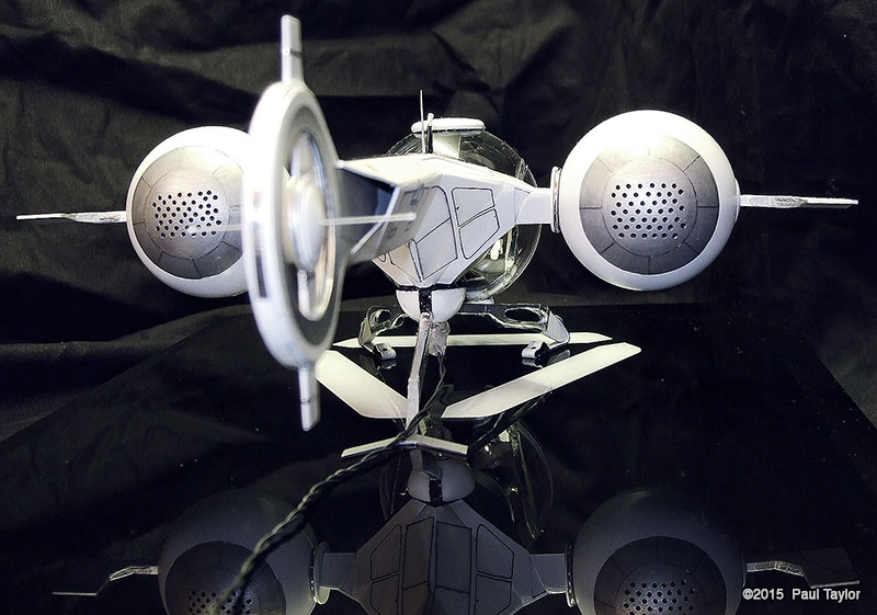 This model is a one-off build and not a kit, which I scratch built and looks stunning on display. It is lighted using tiny SMD LEDs with one inside the cockpit upper ring and one each side of the ball-shaped engine pods. It has a black wooden base with a glass top stand that has the TET emblem on it. The model is approximately 10 inches long x 9.5 inches wide. I am not sure of the scale but would say approx. 1/32. It is powered by a supplied 9-volt battery from the underside of the base which also has an on/off rocker switch. The ball-shaped engine pods can rotate into desired position; the cockpit and guns do not rotate. The model has a 2.1mm x 5mm connector on the underside with cables that loosely run to the rear side of the base. These cables have Bullet Banana Gold Plated Connector Plugs that push into connectors on the base. Image: Base Image: Cockpit Image: Front Left Image: Front Top Image: Rear Image: Rear left Image: Rear Right |