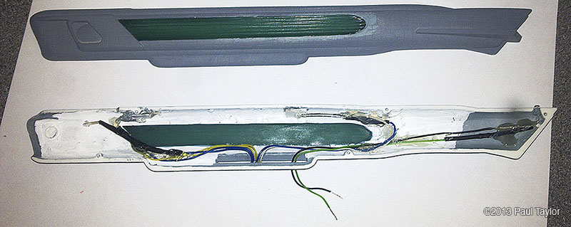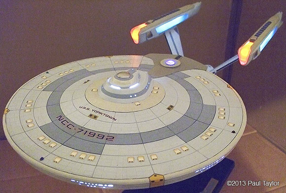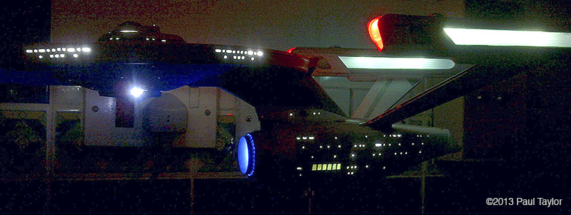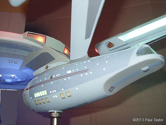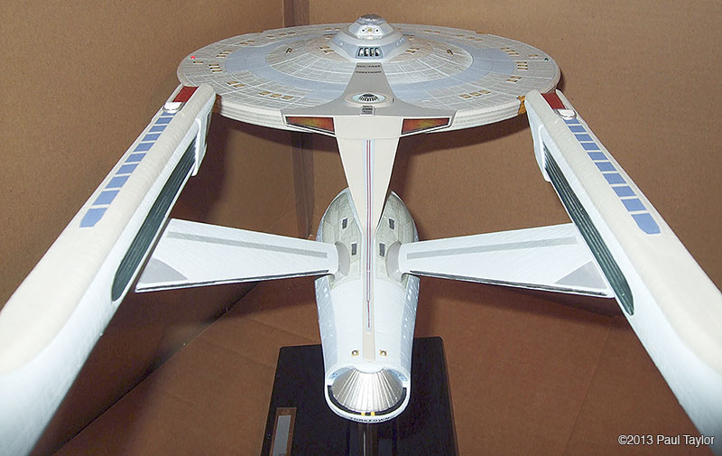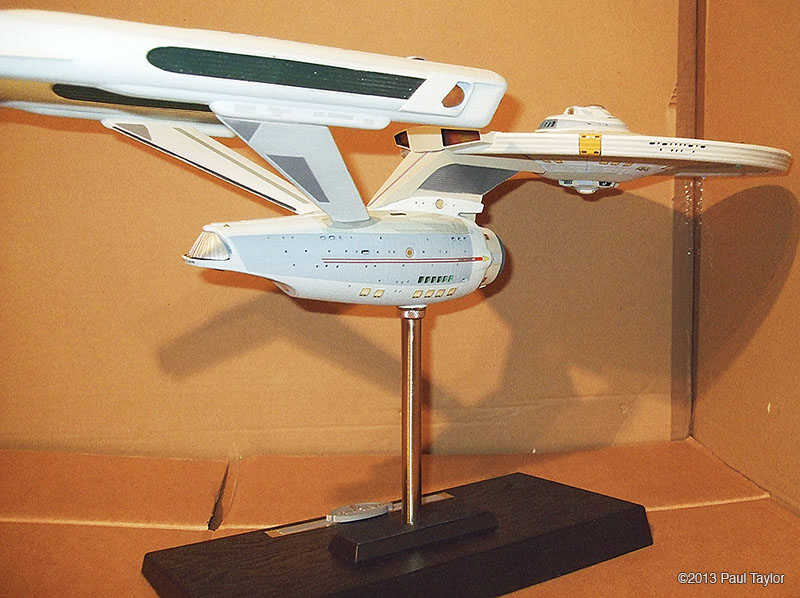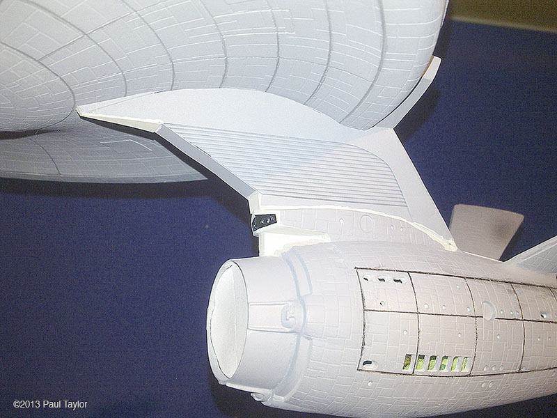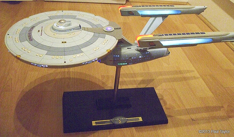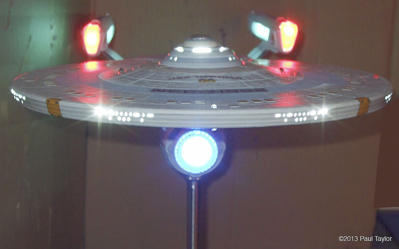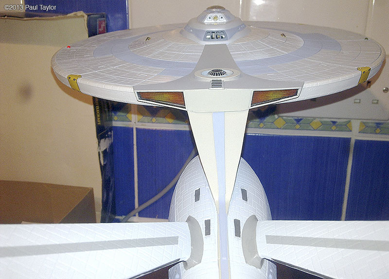 This is my kit bash model of the USS Yorktown from the next generation era, I built this model using the AMT ERTL 1/537 Enterprise kit and is 22" long, fully lit using LEDs and has a custom made base that the model is detachable from. As you can see from the photos, it has been extensively modified with updated, bigger, more impressive impulse engines, the warp engines now have the blue grills on each side, and the front parts are now red which I used from a red bendable plastic ruler. There are also emergency escape life pods added to the hull surfaces which I made in Photoshop and then printed onto photo paper so that they would be raised from the hull surface slightly. The arboretum has been moved one deck up and is also lit up and I chose a green look instead of blue. The docking ports are brass photo etch parts. The VIP lounge at the back of the bridge is also lit and is fitted with a long table and chairs which I crafted myself. The bridge dome has been surgically cut sanded down and re-glued, and the dark grey vertical lines on the neck section are hook-up wire/cable from an old PC. I wanted to base this model around the time of the Enterprise-C or perhaps just before, so I wanted it to resemble the Ambassador class like the thicker neck section the emergency escape life pods and the colour scheme, plus the warp engines. I used custom decals plus DLM parts: main blue deflector dish and blue impulse engine crystal, and my bother cast me the clear blue warp engine grills in resin (thank you). Fitted inside the base, which is from an old 1/18 die cast car, is a circuit board to make the navigation lights flash/blink. The model is powered by a single 9v battery fitted in the underside of the base. There are two on/off rocker switches on the rear of the base, one for the main lighting and one for the navigation lights. This model took me about 3 months to complete and was very enjoyable. Image: Deflector Dish Image: Engines Image: Impulse Image: Lit Impulse Engines Image: Left Image: Front Image: Left Image: Left Lit Image: Right Image: Impulse engines fitted Image: Grill removed Image: Impulse in progress Image: Impulse frame in progress Image: Nacelle in progress Image: New neck in progress |