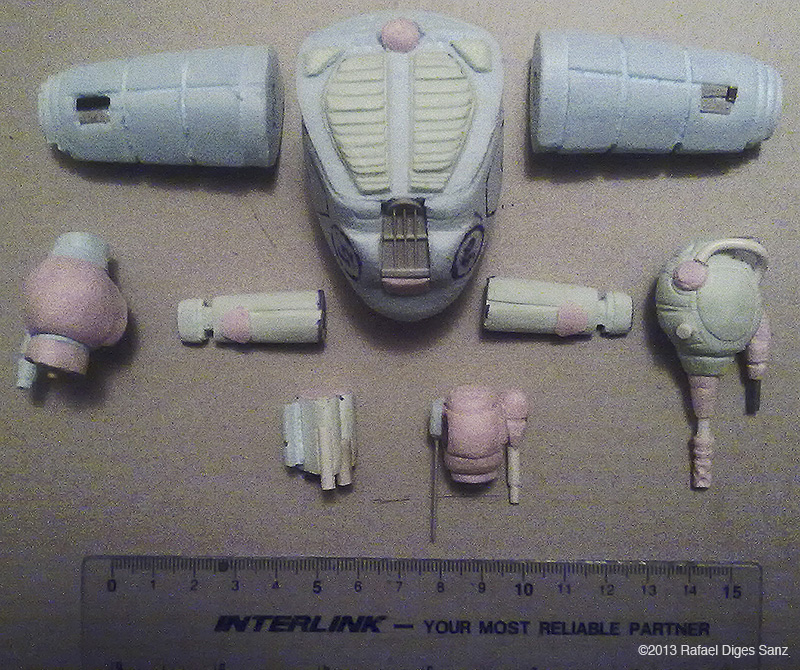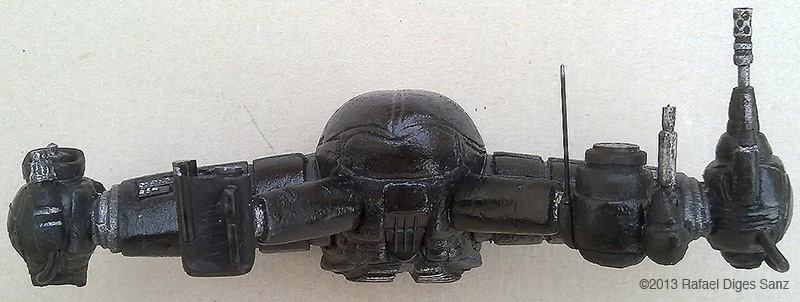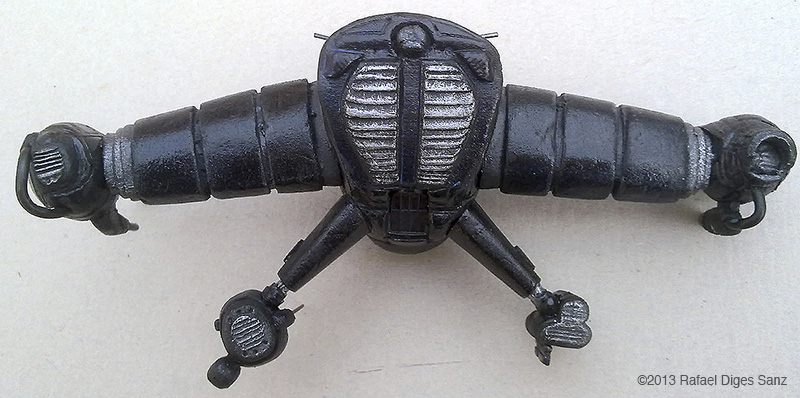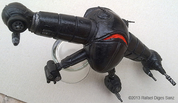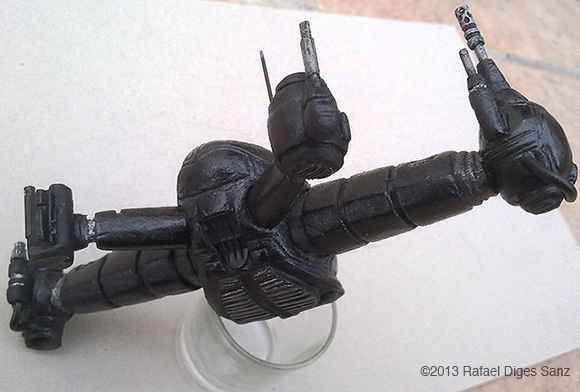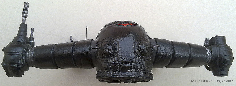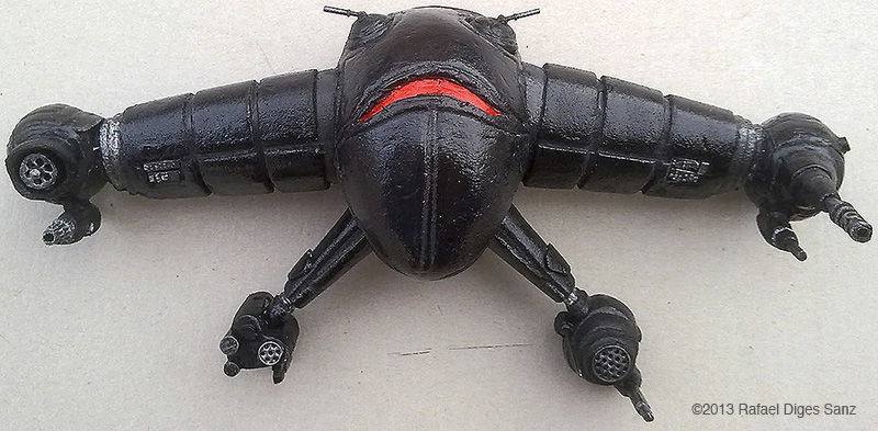The Shadow Droid is a new weapon created by the reborn clone of Emperor Palpatine. It appears in Dark Empire II by Dark Horse comic series into "Star Wars Expanded Universe". The model was carved in extruded polyspan and painted with Royal Talens acrylics in black, grey, gun metal and fluo red, and finished with several layers of gloss coat. Image: Main Parts Image: Parts Image: Bottom Image: Front Image: Rear Image: Top |