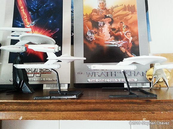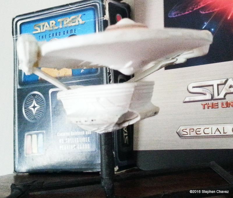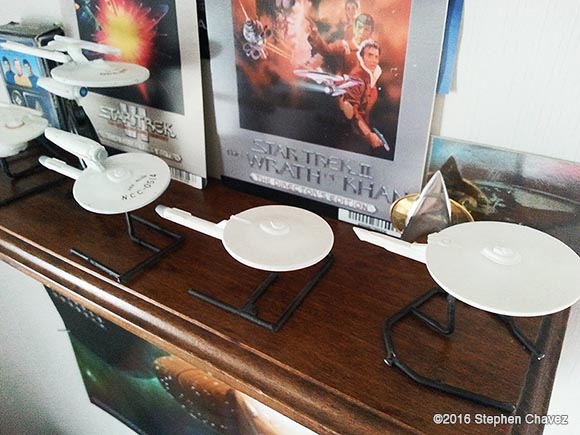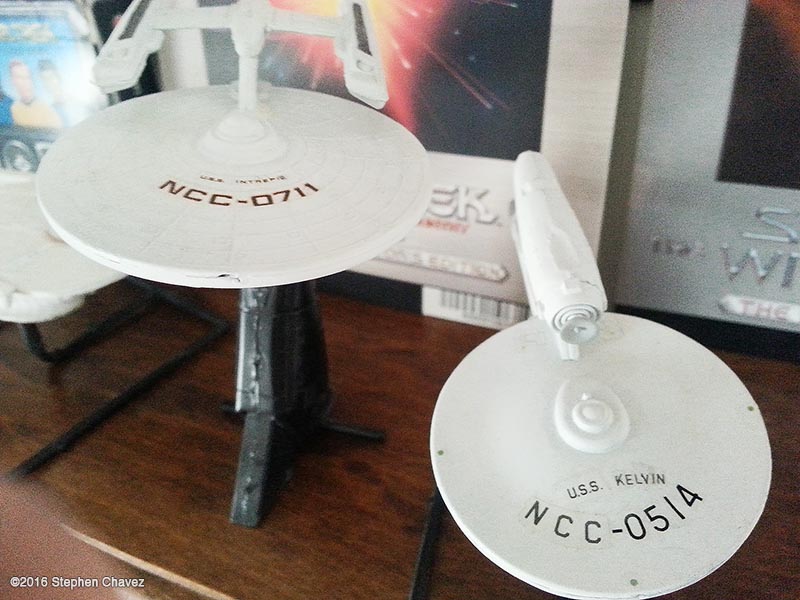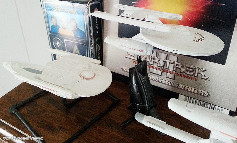 I was off work for five weeks due to a leg injury, and during this time i read 3 Trek novels and built five mix-match models. I think that was a very constructive use of my time. I bought two AMT 1:2500 scale kits. The "Star Trek: The Motion Picture set, which for some reason came with the Reliant, and the "USS Enterprise Starship Set", with the first three generations of Enterprise, not including Captain Archer's ship. My only problem is finding scale decals. I've had to chop-cut to create alternative names and serial numbers, but that limited me to the Intrepid from a Deviantart design, and TOS style Kelvin. The ship using the Enterprise B secondary hull was the most challenging for me. It needed a stand to hold the primary level while the glue dried on the pylons. This ship resembles a TNG ship with the secondary hull protruding out the front instead of the back. I like my design better. Image: Front Image: Low Image: Intrepid & Kelvin Image: Front Image: Top Image: Scout |